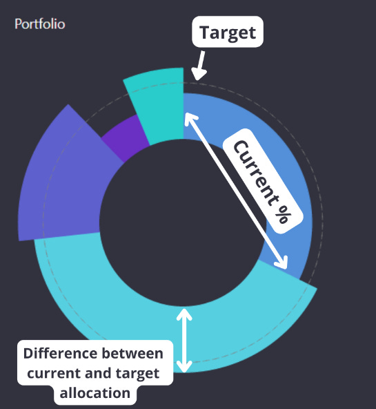 In the pie chart, you can clearly see how far each category is from its target allocation. This visual representation makes it easy to spot any imbalances in your portfolio and quickly assess where adjustments may be needed to bring your allocations back in line with your goals.